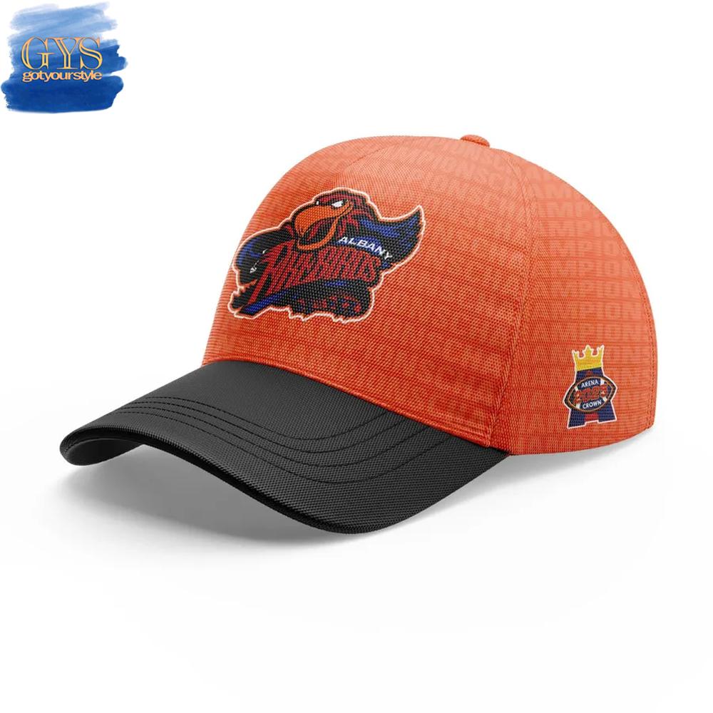 The Albany Firebirds Arena Crown Champions 2025 Limited Edition Hoodie features a vibrant orange, reflecting the team’s colors. The front displays stylized wings above the Firebirds logo and name. The back showcases a celebratory image of the team with the “Arena Crown Champions 2025” title. A repeating “Champions” pattern adds to the celebratory theme. A matching cap is also available.