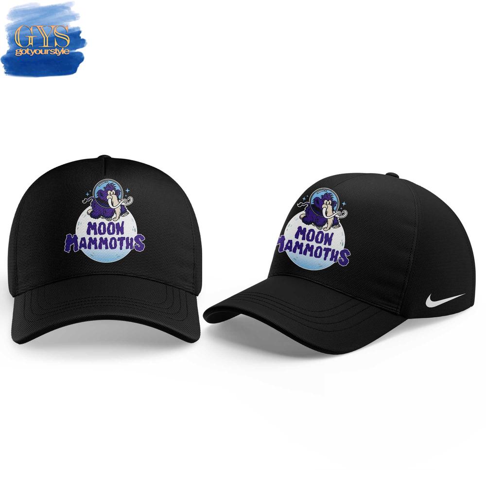 The Erie Moon Mammoths Limited Edition Black Hoodie features a comfortable black base. The front displays the “MOON MAMMOTHS” logo in a stylized purple font, with sparkling stars adding a cosmic touch. A small Nike swoosh is also present. The back of the hoodie showcases the Moon Mammoths mascot, a woolly mammoth in a spacesuit, standing on the moon. The matching sweatpants are black and feature the Moon Mammoths logo and the Nike swoosh. The baseball cap is also black and features the Moon Mammoths logo and the Nike swoosh.
