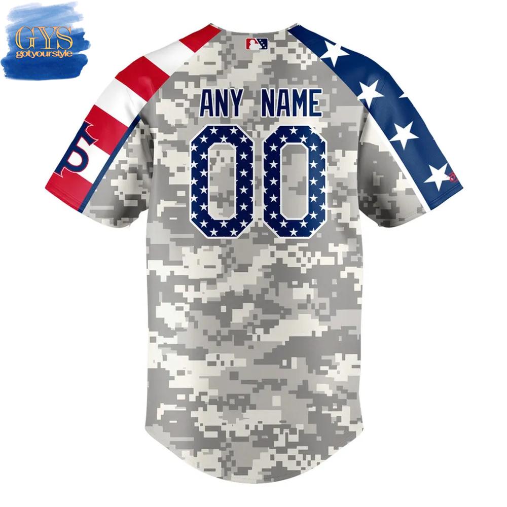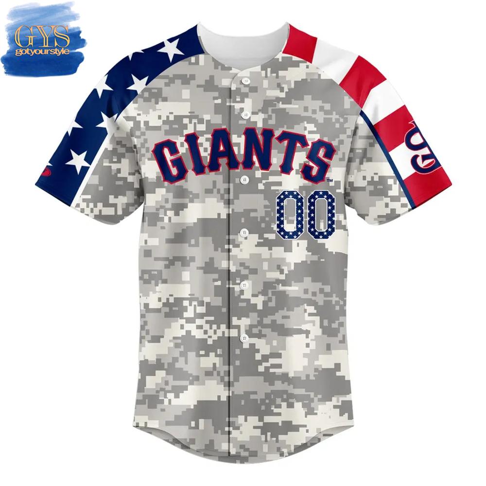 - A Design that Honors Our Troops: The San Jose Giants Military Appreciation Baseball Jersey features a digital camouflage pattern in shades of gray and white. The front displays “GIANTS” and the number “00.” The back can be customized with any name and number. The sleeves feature a patriotic design with stars and stripes.